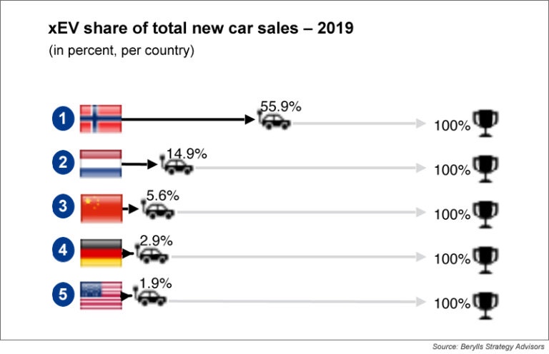 In Cina, la riduzione dei finanziamenti pubblici nel 2019 ha avuto un effetto immediato. A giugno, il sussidio si è dimezzato, passando da un massimo di 6.600 € (7.100 $) a soli 3.300 €; le nuove registrazioni xEV hanno registrato una diminuzione anno su anno di quasi il 4%. Sebbene la Cina abbia fatto molto per sviluppare la sua infrastruttura di ricarica elettrica, con quasi 500.000 punti di ricarica ora accessibili al pubblico, questo effetto positivo è stato più che compensato dal calo dei finanziamenti.