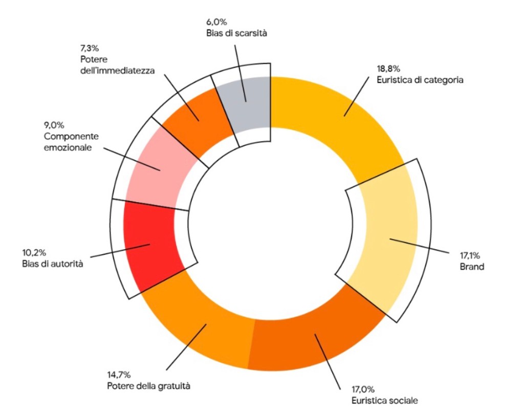 Mantiene un’importanza primaria il Brand con il 17.1%. L’importanza di un bias varia a seconda della categoria e in base ai diversi momenti del percorso d’acquisto. Ad esempio, la componente emozionale è più efficace nella fase di esplorazione, mentre quella sociale lo è nella fase di valutazione.